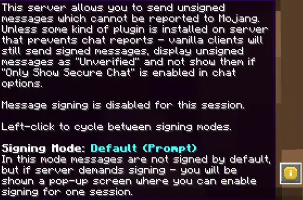 enforce-secure-profile=trueinserver.properties), unsigned messages may not be accepted. - For versions 1.19.1 & 1.19.2: You cannot join servers requiring signed messages unless you accept signing (with a warning prompt).